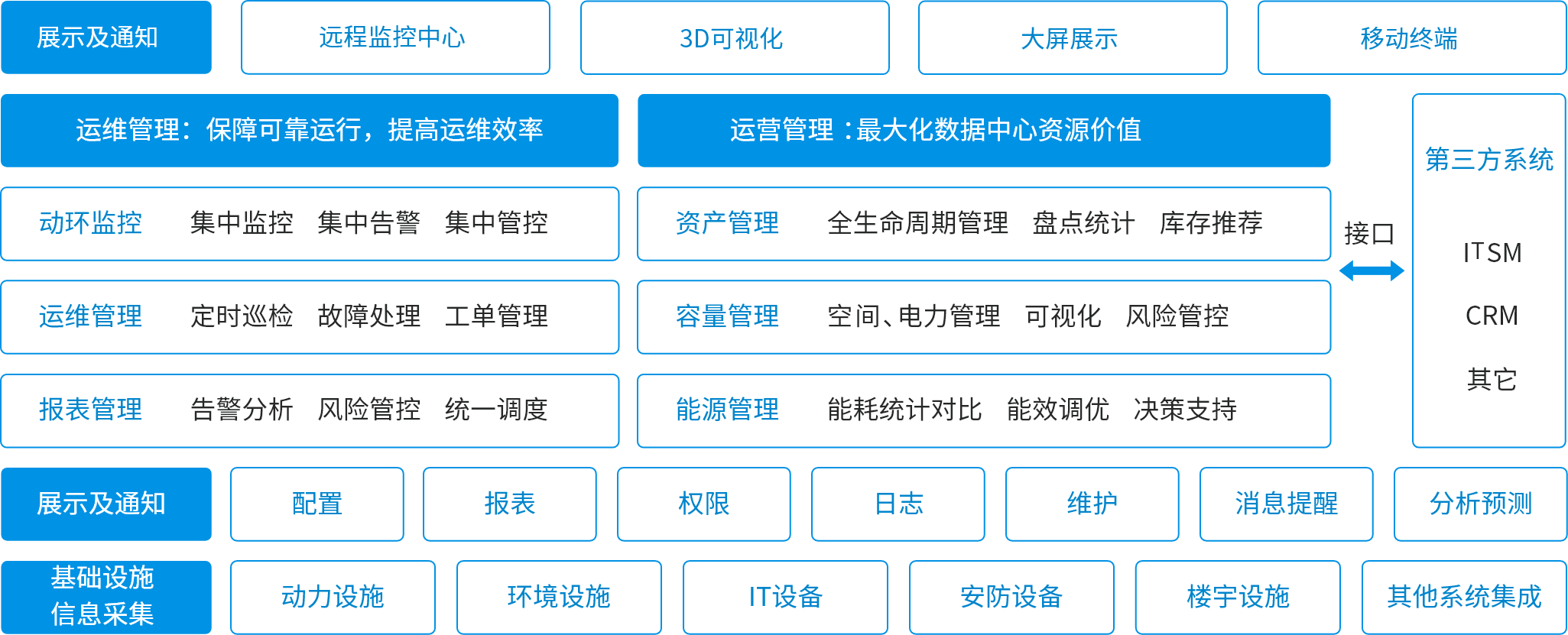 DCIM基礎設施管理系統(tǒng)通過統(tǒng)一的操作平臺和統(tǒng)一的通信平臺,構建“信息、資源"綜合監(jiān)控管理體系。系統(tǒng)融合基礎設施監(jiān)控、資產管理、容量管理、能效管理、運維管理、三維可視化等豐富的管理功能,幫助數(shù)據(jù)中心管理者全面掌握基礎設施整體運行情況,提高數(shù)據(jù)中心資源利用率和管理效率。